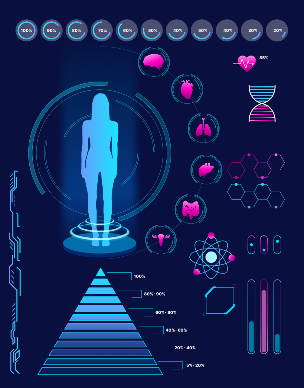- Éléments modulables : organes humains, silhouette, pourcentages, ADN, cœur, cerveau, barres de progression, pyramide, icônes, etc.